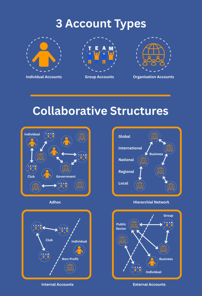 Large organisations can manage multiple accounts (e.g., by country, function, or purpose) and then link them into a single overarching formation for coordination.